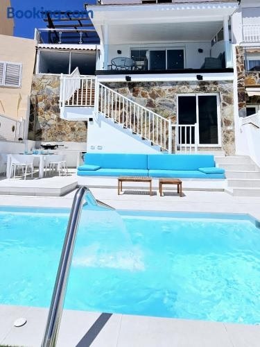 Boasting air-conditioned accommodation with a private pool, pool view and a balcony, Exclusive villa with heated saltwater pool, roof terrace with beautiful views in Mogán is situated in Arguineguín. This recently renovated villa is located 1.